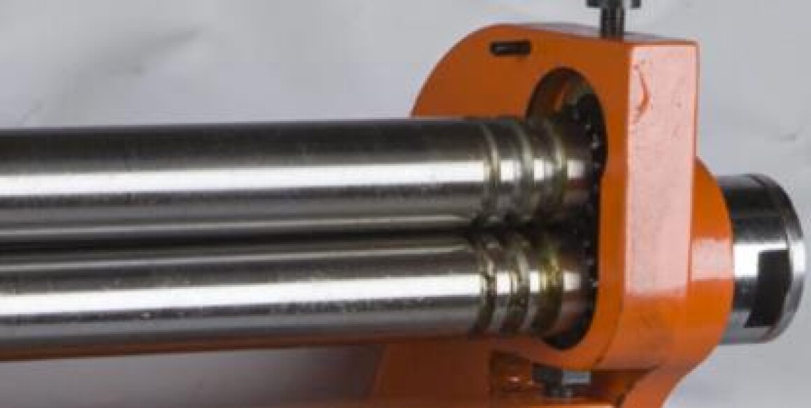 Вальцы имеют трёхваловую конструкцию, верхний вал консольно отводится в сторону для быстрого съёма обечайки.
